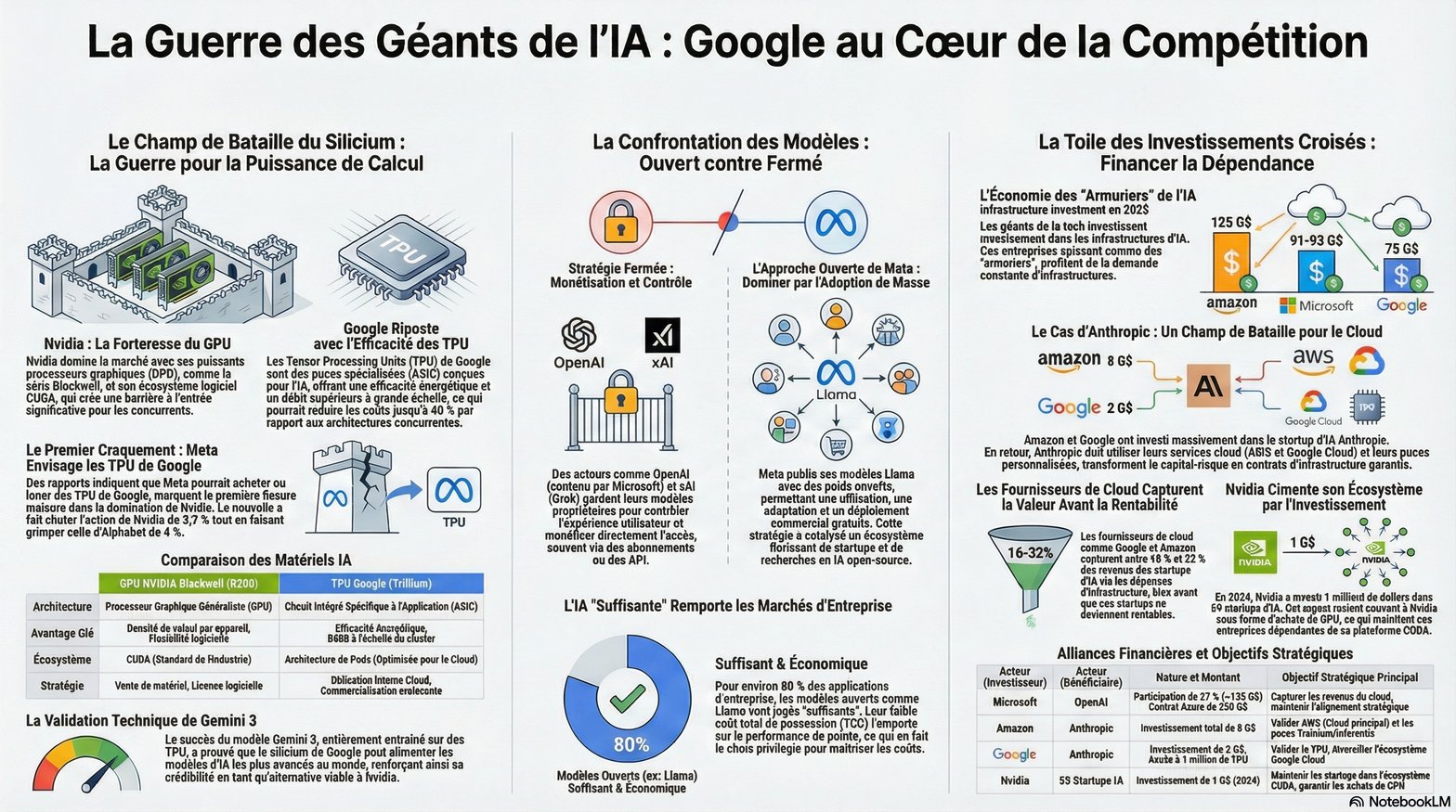 Google d’abord. L’entreprise a décidé de ne plus jouer seulement sur le terrain du logiciel. Elle fabrique ses propres modèles, Gemini 3 et ses déclinaisons, mais aussi ses propres puces, ses propres supercalculateurs, son propre cloud, bref, elle contrôle la totalité de la chaîne et investi sur les prochaines étapes comme l’informatique quantique. Gemini n’est pas un produit isolé, c’est le nouveau moteur de gravité de tout l’écosystème Google. Il se glisse dans la recherche, dans Android, dans Workspace, dans YouTube, sans que l’utilisateur ait besoin de changer d’habitude. En apparence rien ne bouge. En profondeur tout se recompose. Cette intégration totale repose sur une décision stratégique simple, mais redoutable. Google ne veut plus payer la taxe Nvidia. L’entreprise entraîne ses modèles uniquement sur ses TPU (Tensor Processing Unit = unité de traitement de tenseur est un circuit intégré développé par Google pour accélérer les systèmes d'intelligence), déploie ses propres supercalculateurs et commence même à louer cette puissance à des tiers comme Anthropic et peut être Meta demain. Elle devient un fournisseur d’infrastructures pour ses rivaux déclarés. Quand vous consultez un chatbot concurrent, il se peut qu’une partie de sa puissance vienne des puces de Google. Le concurrent devient parfois client avec pour conséquence un rapport de force complexifié.