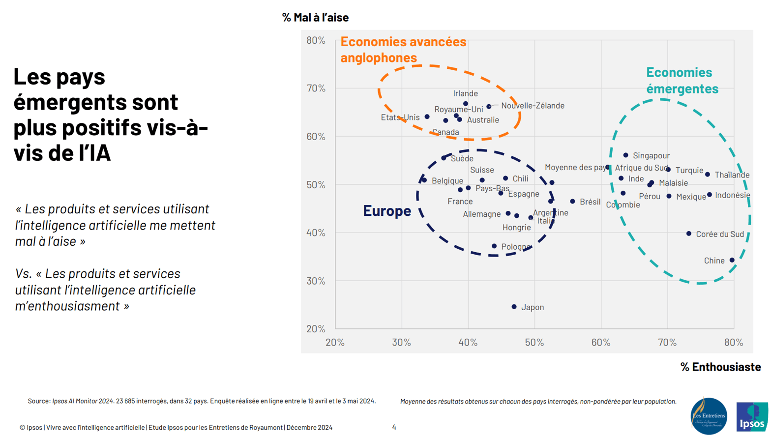Les pays comme la Chine, l’Indonésie ou le Mexique se montrent particulièrement enthousiastes pour des raisons différentes. Pour l'Indonésie et le Mexique, on peut l’interpréter comme une confiance dans le potentiel de l’IA à transformer leur société et accélérer leur développement économique. Pour la Chine, c’est une condition de survie de son modèle sociale et de son importance géopolitique du fait de la décroissance démographique à venir. L’interrogation repose sur l’équilibre à avoir avec des régulations et une réflexion éthique.