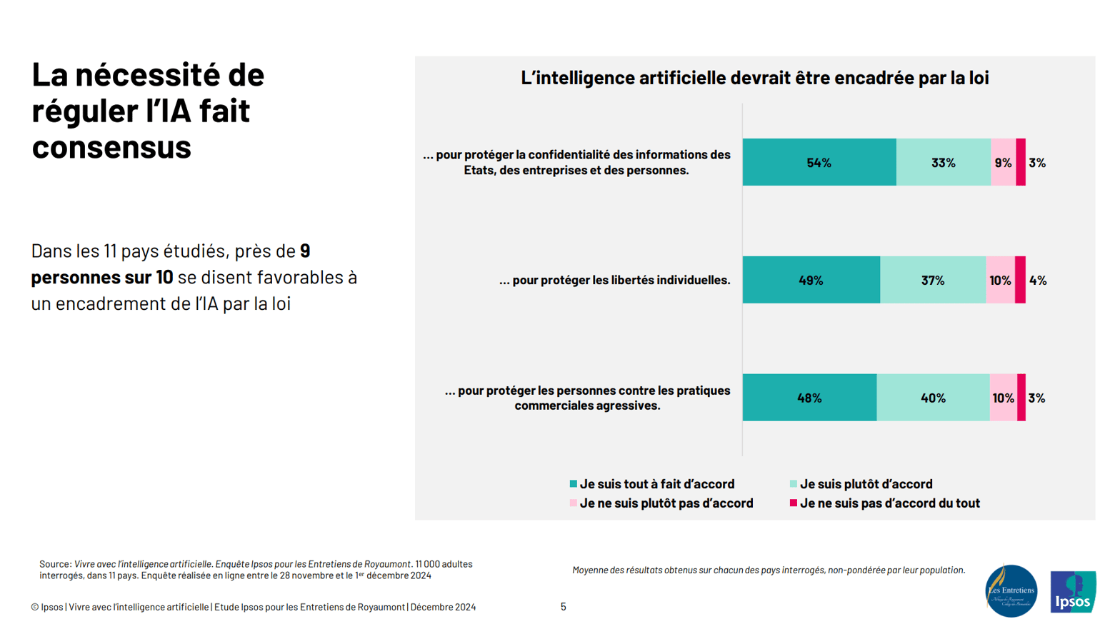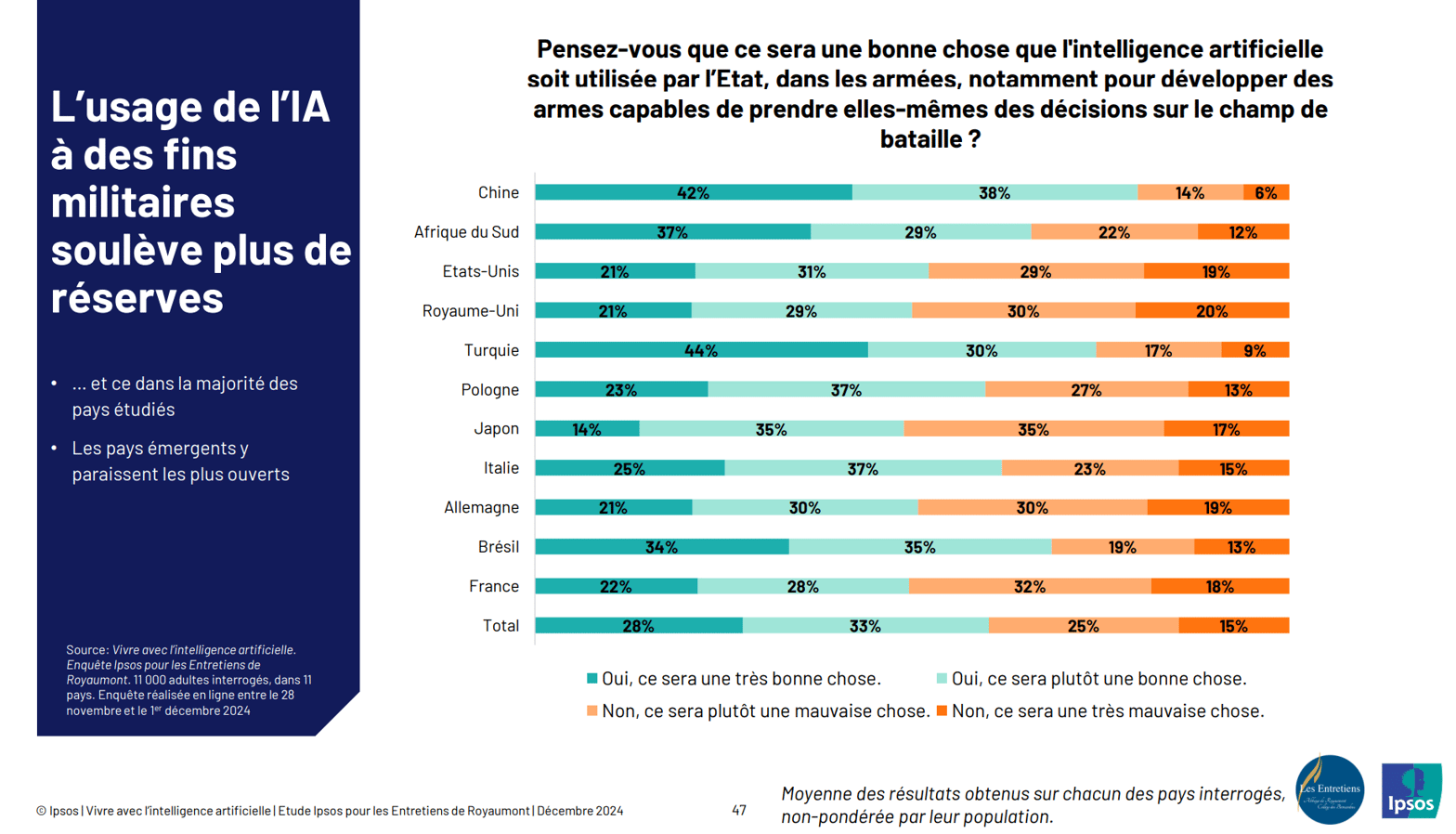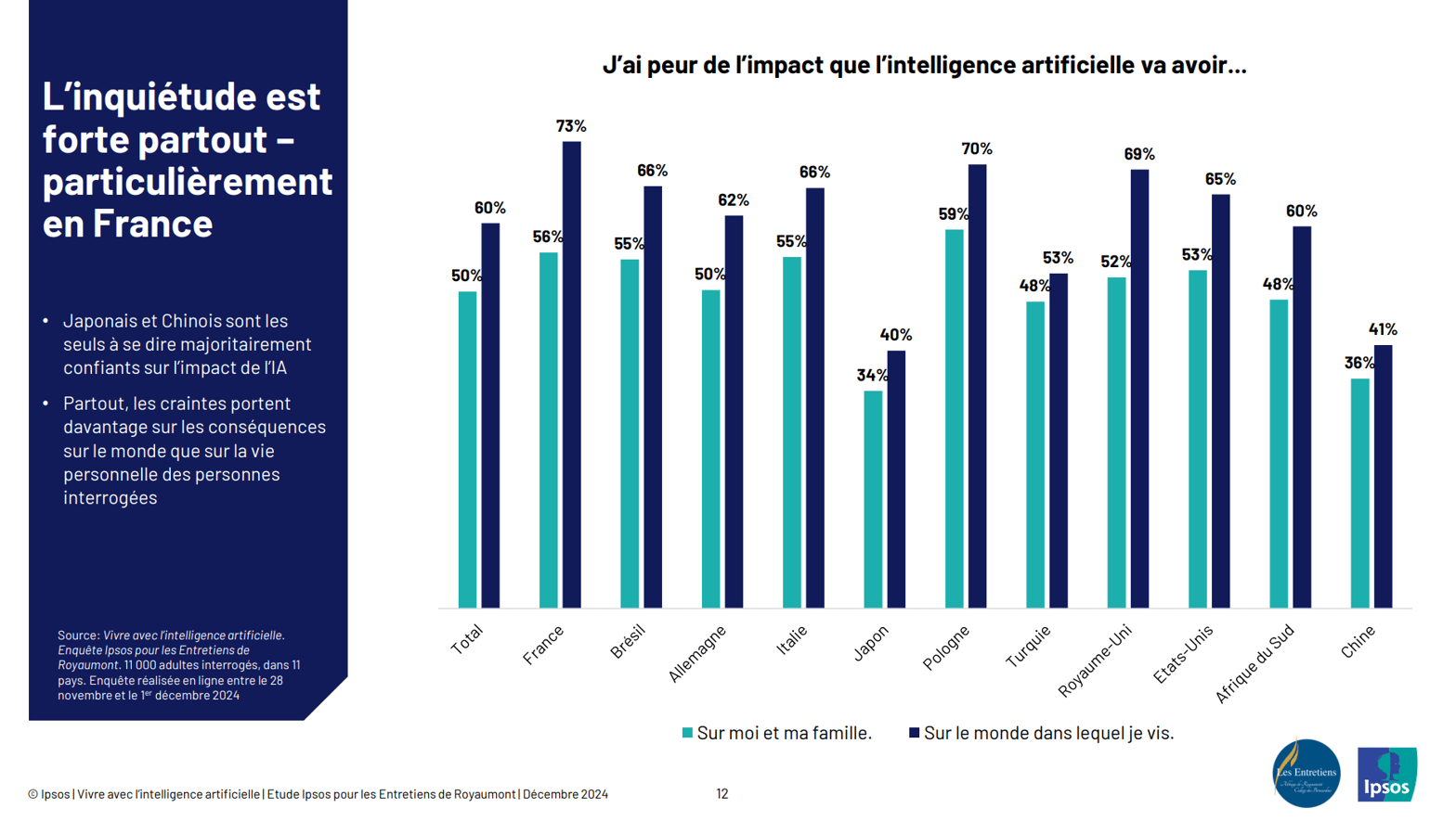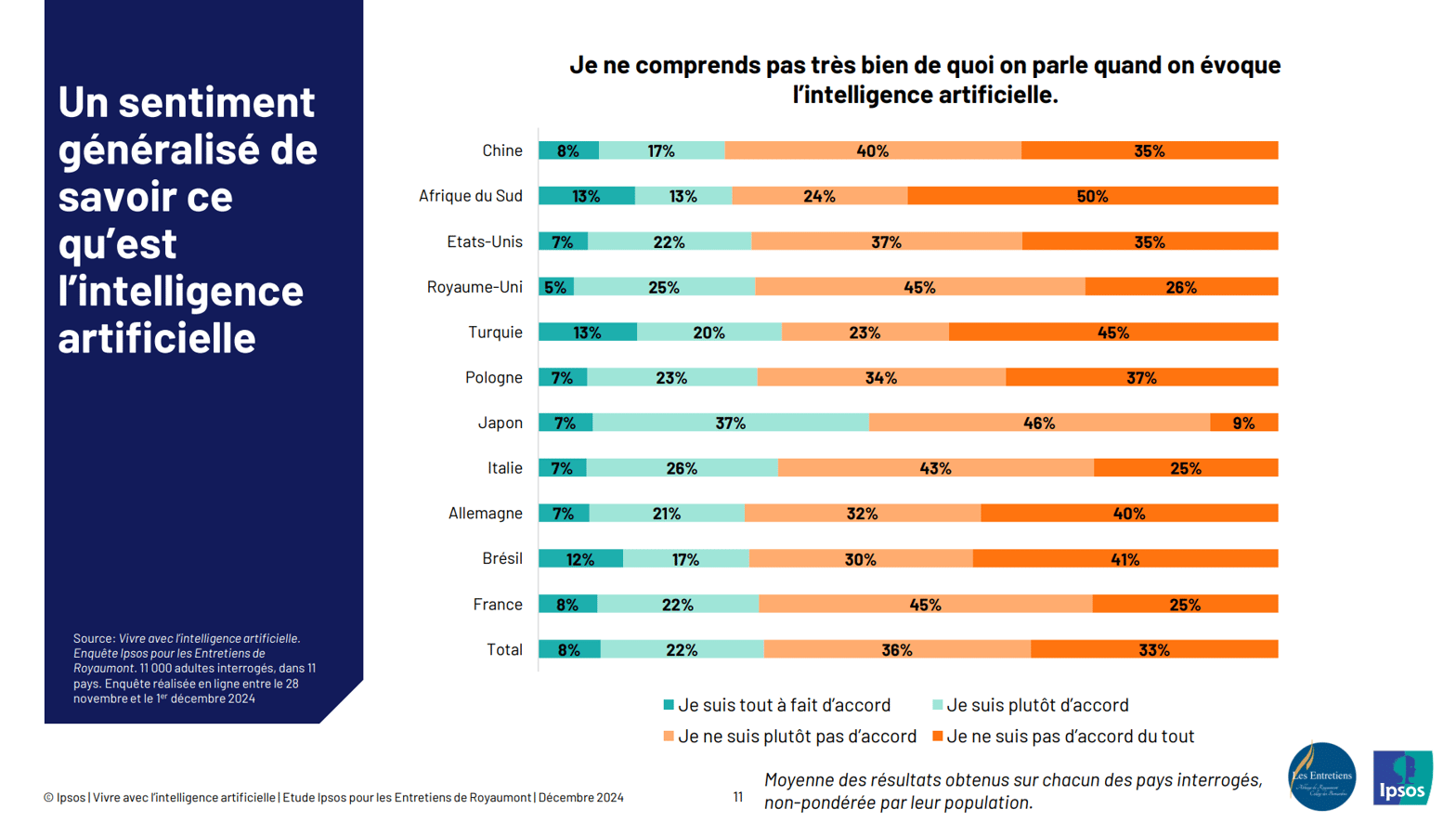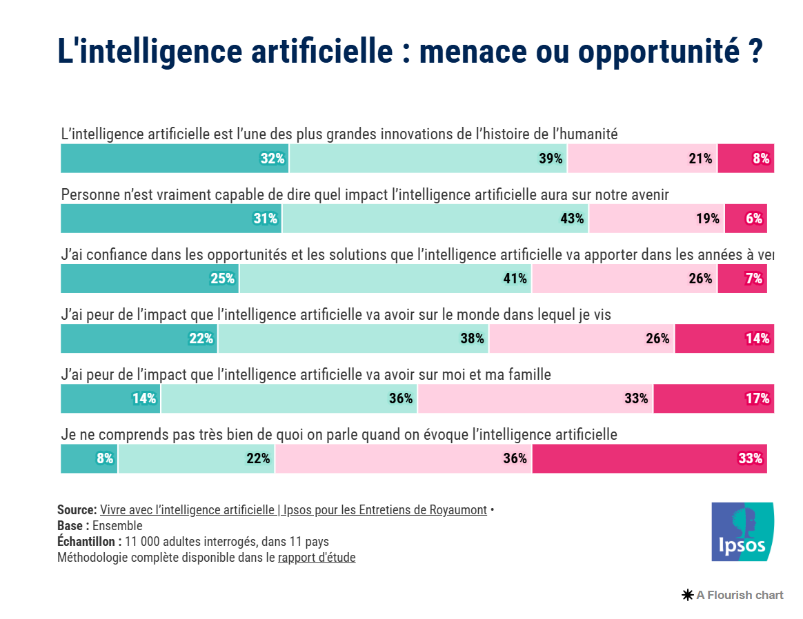 Afin de mieux comprendre la perception de l’IA à travers le monde, Ipsos a mené une grande enquête dans 11 pays, pour la 21ème édition des Entretiens de Royaumont que vous pouvez trouver en détail ici.