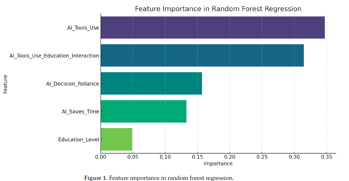 La pensée critique est la variable à expliquer. L’usage de l’IA et une variable qui combine le niveau d’éducation et l’usage de l’IA sont les deux facteurs discriminants le plus la pensée critique.