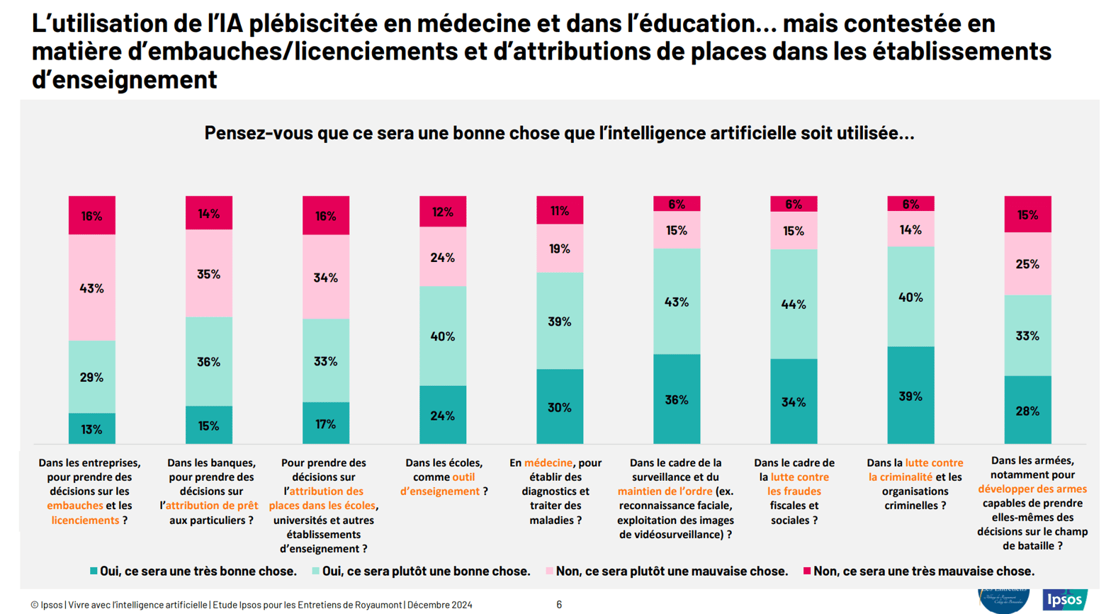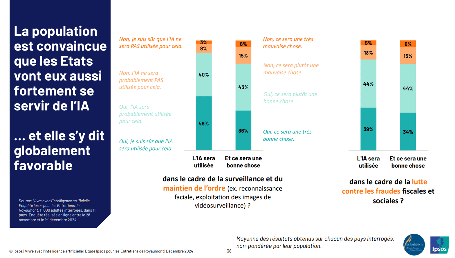 49 % des sondés pensent que l’IA sera utilisée dans le cadre de la surveillance (reconnaissance faciale, vidéosurveillance), et 79 % estiment positif son usage.