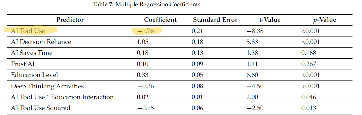 Le coefficient négatif indique que plus l’usage de l’IA est élevé, plus la pensée critique diminue.