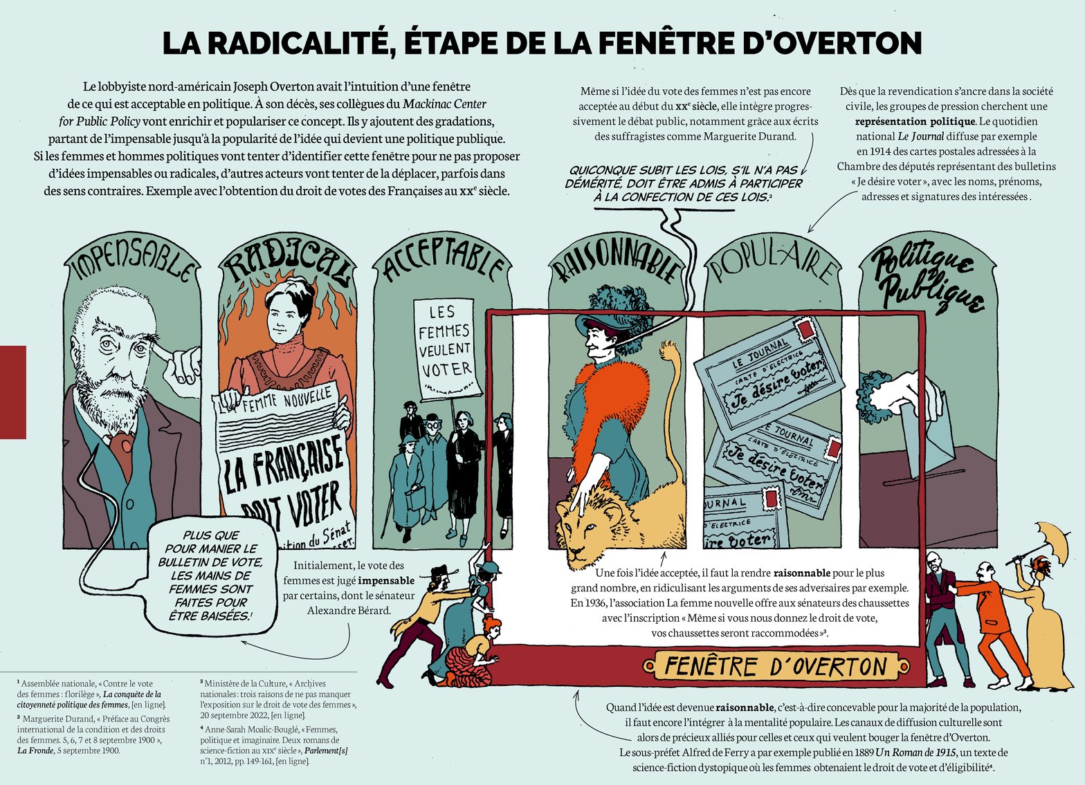 Les algorithmes de recommandation et les bulles de filtres ont un effet paradoxal : alors qu’Internet promettait autrefois un espace d’échanges ouverts, on voit s’accentuer la tendance à se replier sur ses propres certitudes, confortées par des flux de contenus toujours plus ciblés et demain comme expliqué directement alimentés par des membres Ia des médias sociaux. Les plateformes sociales en quête de trafic et d’engagement ont tout intérêt à promouvoir des opinions clivantes, générant des polémiques ou de la désinformation. Ces mécanismes alimentent les replis identitaires et la polarisation politique. Des groupes extrémistes, parfois très minoritaires, bénéficient d’une exposition disproportionnée. Le danger est réel : l’IA peut servir d’accélérateur pour diffuser des discours de haine, manipuler l’opinion publique via des deepfakes ou cibler précisément des segments vulnérables de la population. La fenêtre d’Overton explique cela parfaitement. En voici une illustration très positive avec le droit de vote des femmes.