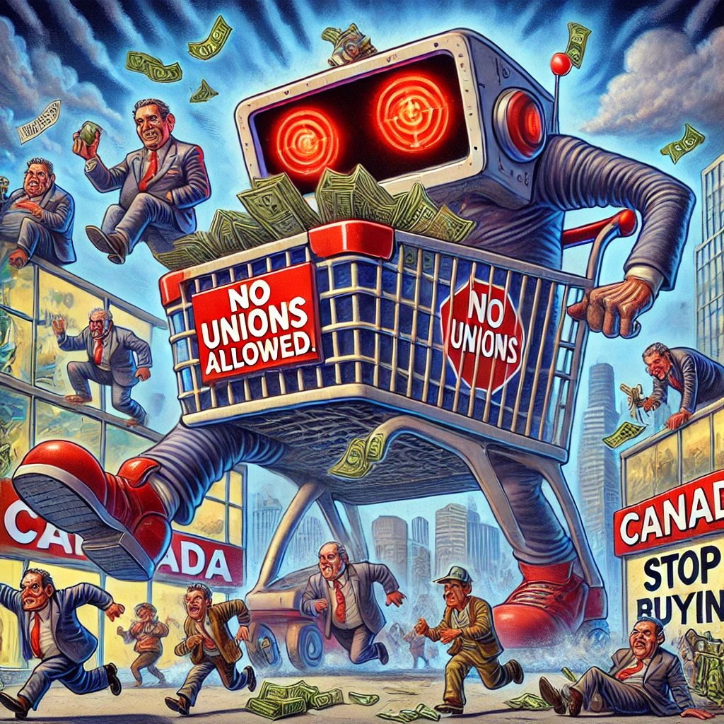 Amazon plie bagage au Canada. 2000 emplois rayés de la carte parce que des travailleurs ont osé revendiquer leurs droits. Jeff Bezos ne se soucie pas du droit du travail. Il s’octroie juste celui d’écraser tout ce qui s’y oppose. Même logiciel prédateur que ses potes oligarques : Musk, Trump, …