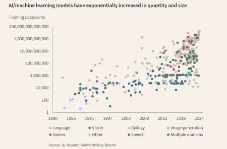 Ce graphique traduit la transition vers des systèmes de plus en plus généralistes (multidomaines) et une adoption massive de techniques de deep learning exigeant d’énormes corpus d’entraînement. La rapide augmentation du volume de données d’entraînement et la diversification des domaines d’IA abordés expliquent l’explosion des consommations énergétiques des datacenters dédiés à l’IA.