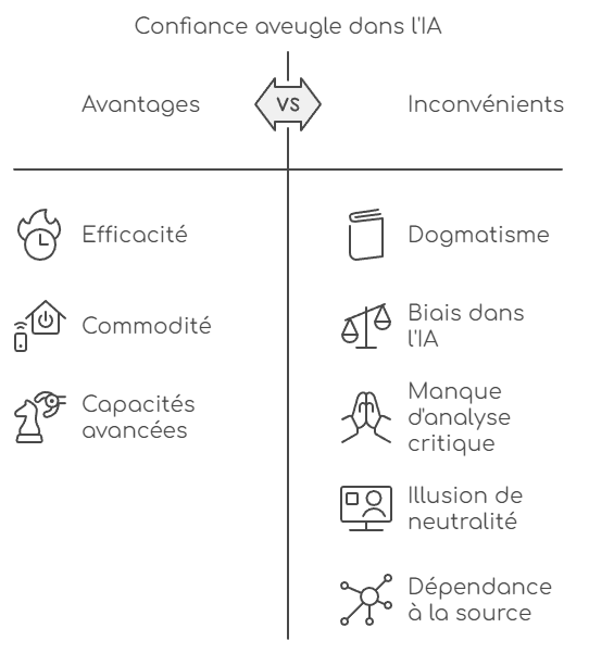 Ce processus s'accompagne également d'un retour aux croyances présentées comme vérités absolues. Lorsque les individus cessent de vérifier les informations par eux-mêmes, la véracité des énoncés dépend de moins en moins de la recherche et de l'analyse critique, et de plus en plus de la source ou du modèle qui les a générés. Ainsi, la confiance aveugle dans la technologie peut générer une nouvelle forme de dogmatisme, dans laquelle les idées préconçues ne sont plus remises en question mais acceptées comme des vérités incontestables. Le danger de ce retour au dogmatisme est d'autant plus grand que les systèmes d'IA ne sont pas exempts de biais : ils reflètent les préjugés et les limites des données sur lesquelles ils ont été entraînés. Cette confiance aveugle renforce l'idée que les réponses fournies par l'IA sont neutres et objectives, alors qu'elles sont le produit d'un ensemble complexe de choix humains, souvent invisibles pour l'utilisateur.