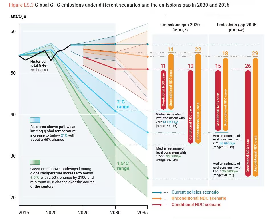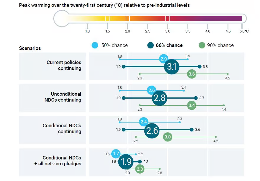 Le rapport du PNUE offre peu d'espoir quant à la possibilité de maintenir l'augmentation des températures sous le seuil de +1,5 °C. Selon les scientifiques, le budget carbone restant pour ne pas dépasser ce seuil est désormais de 200 gigatonnes. Robert Vautard, coprésident du groupe 1 du GIEC, estime qu'il est fort probable que le seuil de +1,5 °C soit franchi dès le début de la prochaine décennie. Quant à l'objectif de +2 °C, il reste théoriquement atteignable, mais nécessitera des mesures immédiates et drastiques, telles que la réduction forte du trafic aérien, l'arrêt de la déforestation, et une transformation radicale des systèmes économiques et énergétiques.