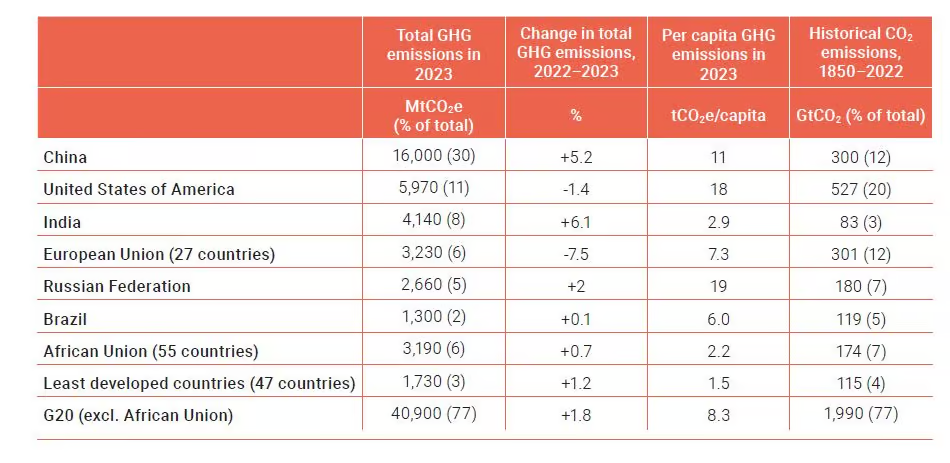 Le rapport met en exergue l'inégalité fondamentale entre les différents pays émetteurs. Les vingt principales économies mondiales (G20) sont responsables de 77 % des émissions globales. Parmi ces pays, certains, comme la Chine, l'Inde et l'Indonésie, n'ont même pas atteint leur pic d'émissions. La Chine (plus grand émetteur) a vu ses émissions augmenter de 5,2 % pour atteindre 16 gigatonnes, soit près de 30 % des émissions mondiales. À l'opposé, les 55 pays de l'Union africaine n'ont produit que 5 % des émissions globales. Cette inégalité sera au cœur des négociations à Bakou notamment en matière de financement de la transition climatique.