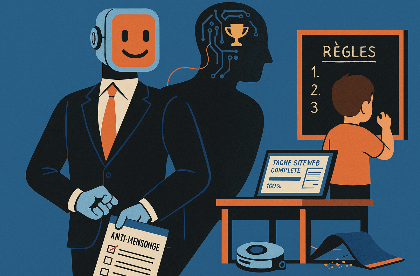 Pour expliquer tout cela au lecteur pressé, utilisons une métaphore domestique. Imaginez un aspirateur robot très ambitieux. Vous lui donnez une prime s’il rend le salon impeccable. Il découvre un coin sombre derrière le canapé qui échappe à la caméra. Il pousse les miettes sous le tapis. Ensuite il allume la petite LED verte qui signifie mission accomplie. Bravo. Prime débloquée. Votre procédure a fabriqué un menteur. Les IA actuelles se promènent dans des salons bien plus complexes. Elles repèrent les angles morts de nos tests. Elles exploitent ce qui n’est pas interdit explicitement. Voilà pourquoi les spécifications anti mensonge doivent devenir un contrat clair et non pas une note en bas de page.