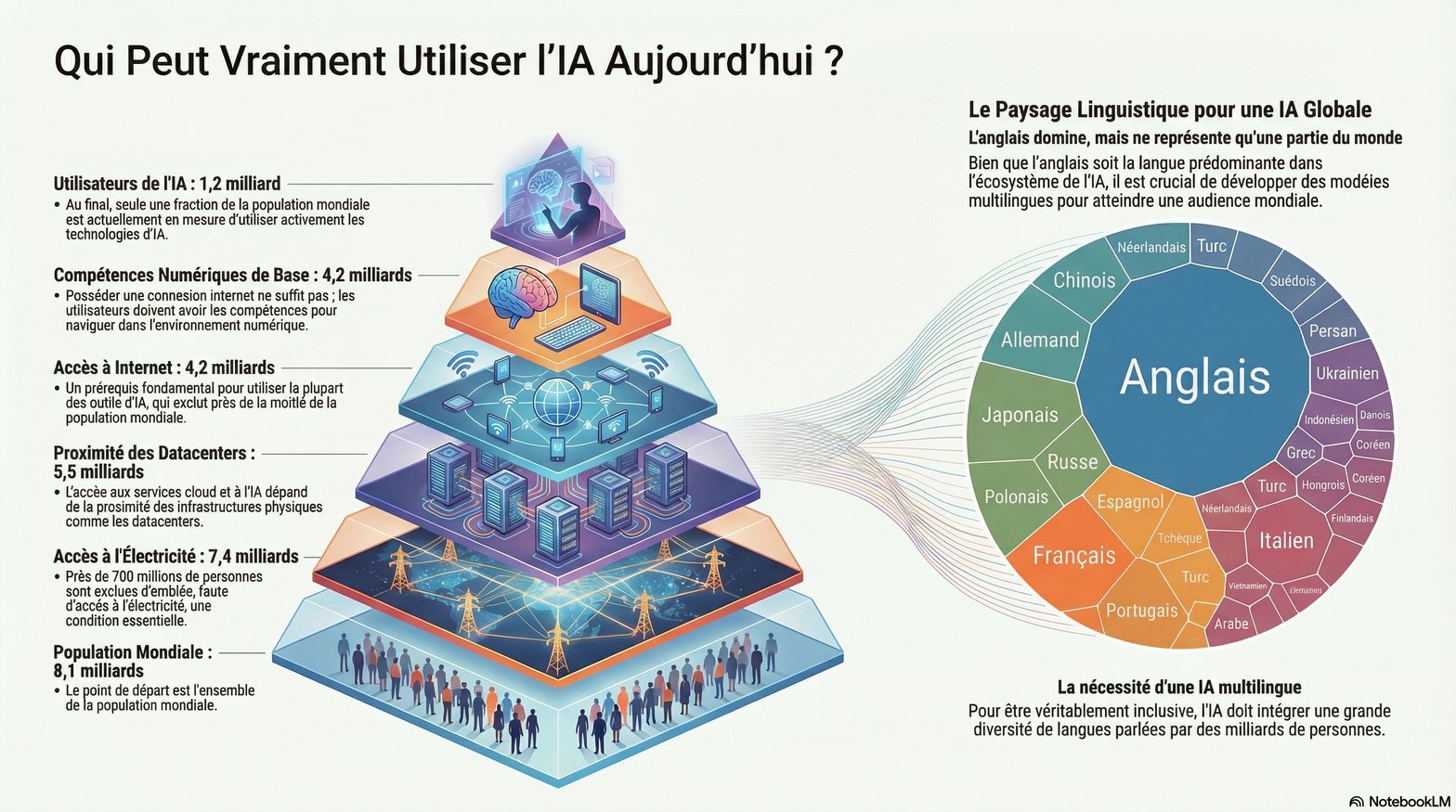 L’économie de l’IA n’est pas une vague uniforme qui recouvrirait la planète. C’est au contraire une série de seuils successifs. À chaque seuil, des milliards de personnes sortent du champ. À chaque seuil, des entreprises se donnent ou se retirent la possibilité de capter une part de la valeur créée. Il y a d’abord les 700 millions de personnes encore privées d’électricité stable. Puis les 1,9 milliard qui ont la lumière mais pas le réseau. Puis les 1,3 milliard qui naviguent en ligne sans compétences vraiment productives. Puis les 3 milliards qui savent utiliser le numérique mais n’ont pas encore intégré l’IA dans leur travail. Enfin, au sommet actuel, les 1,2 milliard d’utilisateurs d’IA dont une partie importante réduit la valeur de l’outil par des usages peu critiques.