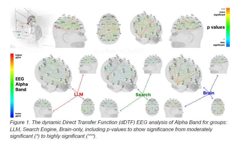 Le groupe LLM a montré le couplage global le plus faible avec une connectivité réduite en particulier dans la bande thêta (associée à la mémoire de travail) ce qui montre un allègement de la charge cognitive grâce à l'assistance de l'IA.