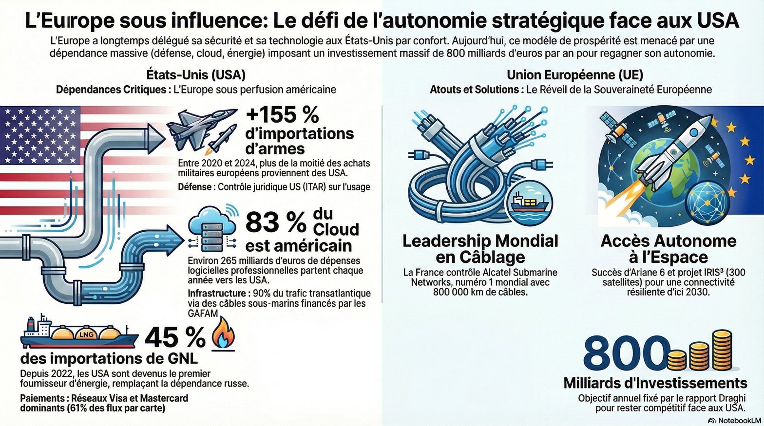 Résultat : en 2026, nous découvrons que notre modèle de prospérité repose sur une série de prises multiples branchées sur Washington, la Silicon Valley, Houston ou Seattle. Défense, spatial, cloud, énergie, paiements, données, IA. Si on suit les câbles, on sort très vite du territoire européen. Cette situation n’est pas un complot américain. Elle est juste le produit de nos propres renoncements, de notre paresse collective à décider, investir, mutualiser et à avancer. Draghi chiffre l’effort manquant entre 750 et 800 milliards d’euros d’investissements supplémentaires par an pour l’Europe pour rester dans la course face aux États-Unis et à la Chine, en combinant dette commune, capital privé et stratégie industrielle assumée. Et pour l’instant, nous bricolons.