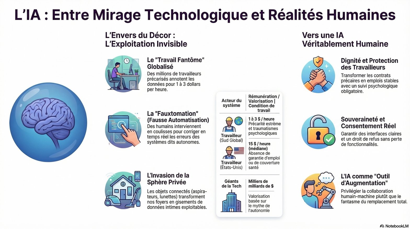 Reconnaître et protéger le travail humain derrière l'IA. Les travailleurs de la donnée ne sont pas des fantômes. Ils sont les architectes invisibles de l'intelligence artificielle. Leur contribution mérite reconnaissance, rémunération juste et protection sociale. Les contrats précaires doivent céder la place à des emplois stables. Les temps d'attente et de formation doivent être rémunérés. L'exposition à des contenus traumatisants doit s'accompagner d'un suivi psychologique obligatoire, financé par l'employeur.